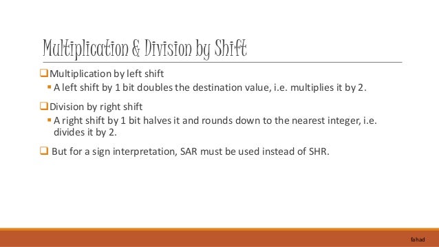4. 4. Multiplication & Division by Shift Multiplication by left shift  A left shift by 1 bit doubles the destination value, i.e. multiplies it by 2. Division by right shift  A right shift by 1 bit halves it and rounds down to the nearest integer, i.e. divides it by 2.  But for a sign interpretation, SAR must be used instead of SHR. fahad