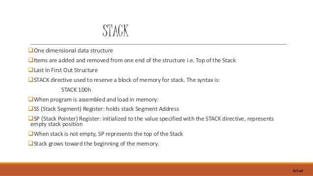 6. 6. STACK One dimensional data structure Items are added and removed from one end of the structure i.e. Top of the Stack Last In First Out Structure STACK directive used to reserve a block of memory for stack. The syntax is: STACK 100h When program is assembled and load in memory: SS (Stack Segment) Register: holds stack Segment Address SP (Stack Pointer) Register: initialized to the value specified with the STACK directive, represents empty stack position When stack is not empty, SP represents the top of the Stack Stack grows toward the beginning of the memory. fahad