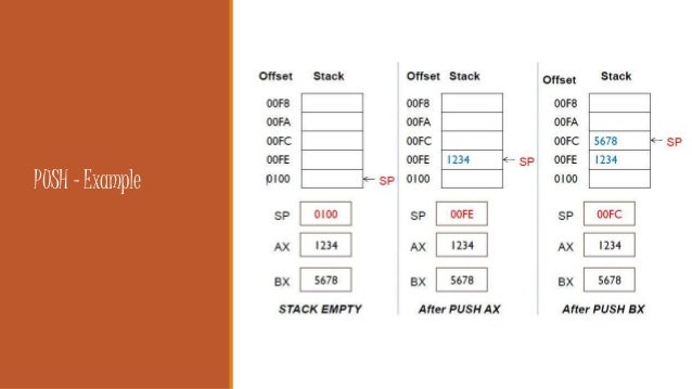 8. 8. PUSH PUSH: Used to add a new source (16-bit register or memory word) on stack Syntax: PUSH source Execution of PUSH causes: SP is decreased by 2 A copy of source contents is moved to the address specified by SS:SP. Source remains unchanged fahad