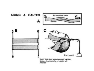 This document discusses different types of traction used in medical treatment, including skin traction methods like Buck's extension, Russell's traction, and Bryant's traction that use belts and harnesses on the body. It also covers skeletal traction techniques such as overhead arm traction, balanced suspension traction, skeletal tongs, and halo traction that apply traction directly to the bones. Halo traction, in particular, uses a ring placed around the head to immobilize the skull and neck.