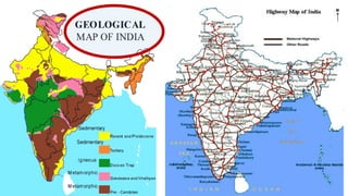 Maps contain essential features to help readers understand the information. These features include a title, grid, scale, legend, and directions. The title identifies the map. A grid uses horizontal and vertical lines of latitudes and longitudes. The scale provides the ratio between distances on the map and ground. A legend uses symbols to represent features that are difficult to depict clearly. Directions are shown using cardinal points like N, E, W, S and intermediate directions.