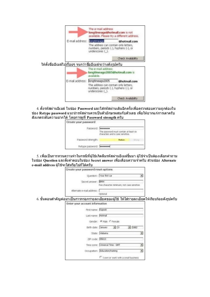 2. 2. ให้ตั้งชื่ออีเมล์ไปเรื่อยๆ จนกว่ำชืออีเมล์จะว่ำงดังรูปครับ ่ 4. ตังรหัสผ่ำนอีเมล์ ในช่อง Password และใส่รหัสผ่ำนเดิมอีกครั้งเพื่อตรวจสอบควำมถูกต้องใน ้ช่อง Retype password แนะนำำรหัสผ่ำนควรเป็นตัวอักษรผสมกับตัวเลข เพือให้ยำกแก่กำรเดำครับ ่สังเกตระดับควำมยำกได้ โดยกำรดูที่ Password strength ครับ 5. เพือเป็นกำรทวนควำมจำำในกรณีที่ผู้ใช้เกิดลืมรหัสผ่ำนอีเมล์ขึ้นมำ ผู้ใช้จำำเป็นต้องเลือกคำำถำม ่ในช่อง Question และตั้งคำำตอบในช่อง Secret answer เพื่อเตือนควำมจำำครับ ส่วนช่อง Alternatee-mail address ผู้ใช้จะใส่หรือไม่ก็ได้ครับ 6. ขั้นตอนสำำคัญต่อมำเป็นกำรกรอกรำยละเอียดของผู้ใช้ ให้ใส่รำยละเอียดให้เรียบร้อยดังรูปครับ