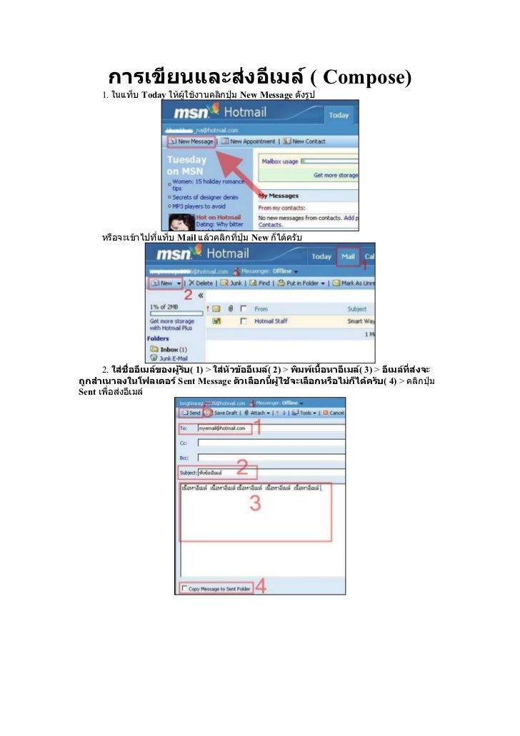 3. 3. การเขียนและส่งอีเมล์ ( Compose) 1. ในแท็บ Today ให้ผู้ใช้งำนคลิกปุ่ม New Message ดังรูป หรือจะเข้ำไปที่แท็บ Mail แล้วคลิกที่ปุ่ม New ก็ได้ครับ 2. ใส่ชื่ออีเมล์ของผู้รับ( 1) > ใส่หัวข้ออีเมล์( 2) > พิมพ์เนื้อหาอีเมล์( 3) > อีเมล์ที่ส่งจะถูกสำาเนาลงในโฟลเดอร์ Sent Message ตัวเลือกนี้ผู้ใช้จะเลือกหรือไม่ก็ได้ครับ( 4) > คลิกปุ่มSent เพือส่งอีเมล์ ่