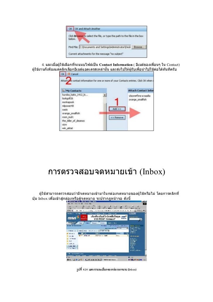 6. 6. 4. และเมือผู้ใช้เลือกที่จะแนบไฟล์เป็น Contact Information ( อีเมล์ของเพือนๆ ใน Contact) ่ ่ผู้ใช้งำนก็เพียงแต่คลิกเลือกอีเมล์แอดเดรสเหล่ำนั้น และส่งไปให้ผู้รับเพื่อนำำไปใช้ต่อได้ทันทีครับ กำรตรวจสอบจดหมำยเข้ำ (Inbox) ผูใช้สำมำรถตรวจสอบว่ำมีจดหมำยเข้ำมำในกล่องจดหมำยของผู้ใช้หรือไม่ โดยกำรคลิกที่ ้ปุ่ม Inbox เพื่อเข้ำสู่กล่องหรือตู้จดหมำย จะปรำกฎหน้ำจอ ดังนี้