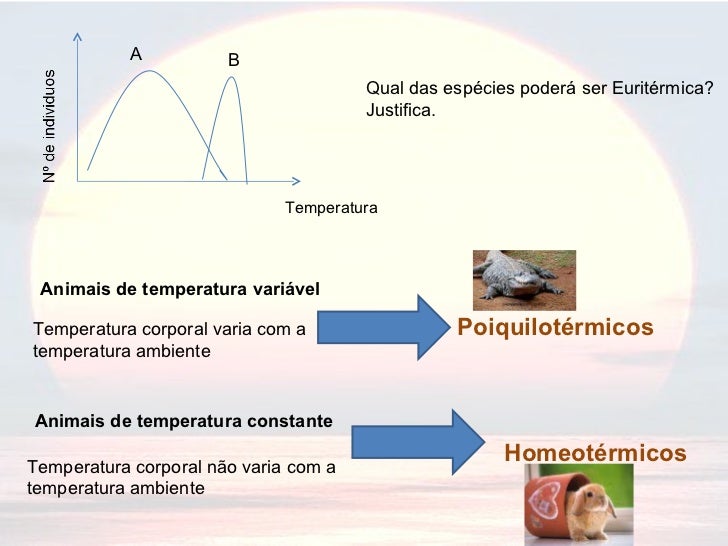 10. 10. Temperatura A B Qual das espécies poderá ser Euritérmica? Justifica. Animais de temperatura variável Temperatura corporal varia com a temperatura ambiente Poiquilotérmicos Animais de temperatura constante Temperatura corporal não varia com a temperatura ambiente Homeotérmicos