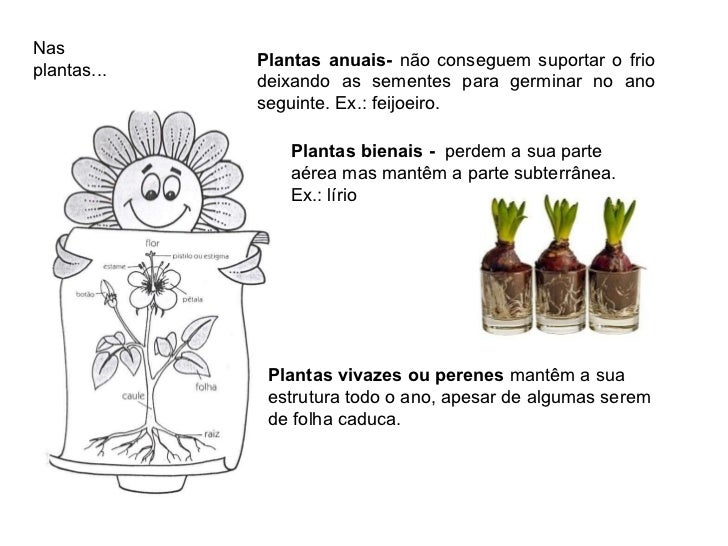 13. 13. Nas plantas... Plantas anuais- não conseguem suportar o frio deixando as sementes para germinar no ano seguinte. Ex.: feijoeiro. Plantas bienais - perdem a sua parte aérea mas mantêm a parte subterrânea. Ex.: lírio Plantas vivazes ou perenes mantêm a sua estrutura todo o ano, apesar de algumas serem de folha caduca.