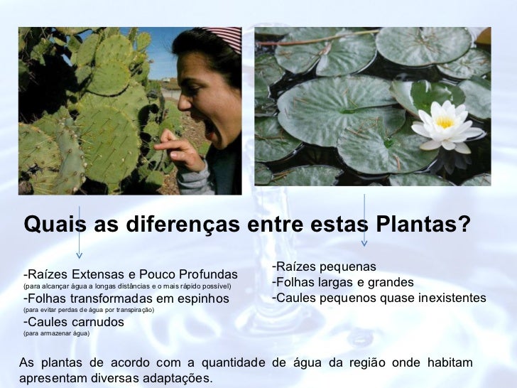 Quais as diferenças entre estas Plantas? As plantas de acordo com a quantidade de água da região onde habitam apresentam d...