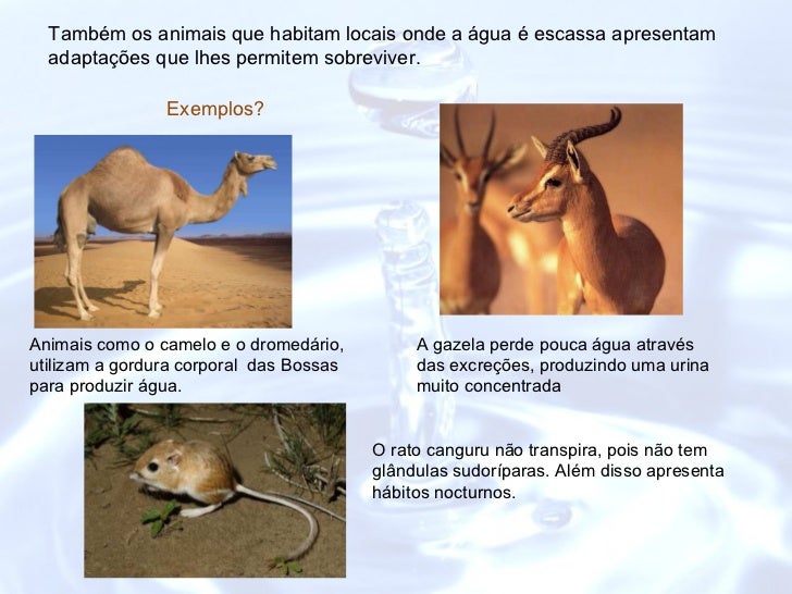 Também os animais que habitam locais onde a água é escassa apresentam adaptações que lhes permitem sobreviver. Exemplos? A...