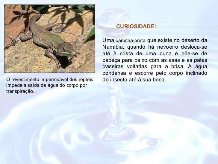 17. 17. O revestimento impermeável dos répteis impede a saída de água do corpo por transpiração. Uma carocha-preta que existe no deserto da Namíbia, quando há nevoeiro desloca-se até à crista de uma duna e põe-se de cabeça para baixo com as asas e as patas traseiras voltadas para a brisa. A água condensa e escorre pelo corpo inclinado do insecto até à sua boca. CURIOSIDADE: