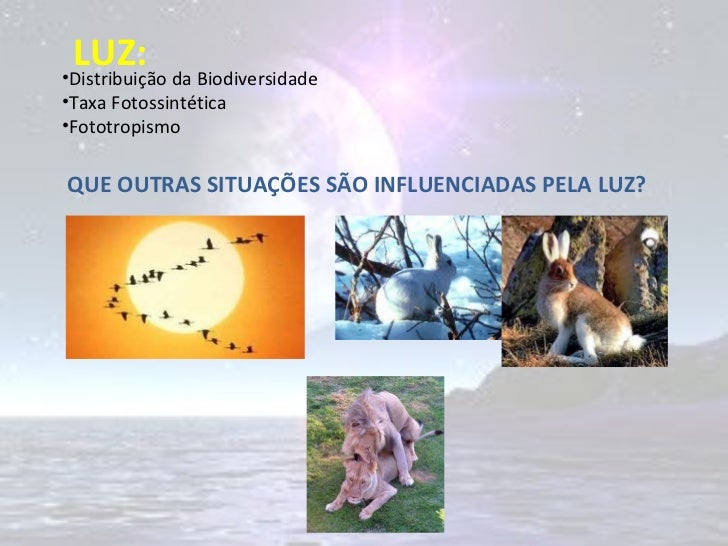 2. 2. LUZ: <ul><li>Distribuição da Biodiversidade </li></ul><ul><li>Taxa Fotossintética </li></ul><ul><li>Fototropismo </li></ul>QUE OUTRAS SITUAÇÕES SÃO INFLUENCIADAS PELA LUZ?