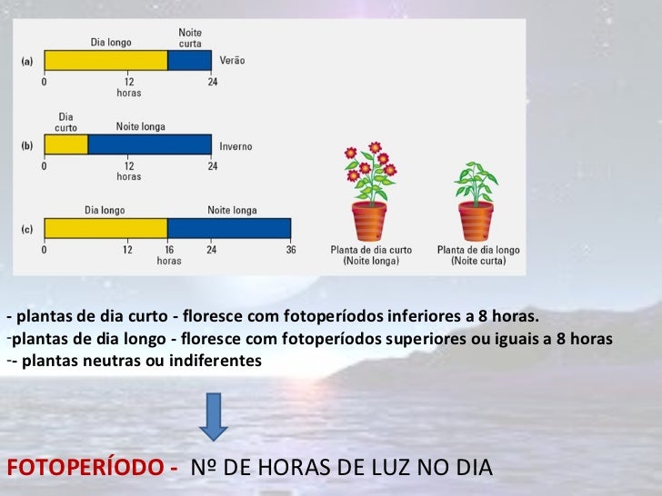<ul><li>- plantas de dia curto - floresce com fotoperíodos inferiores a 8 horas. </li></ul><ul><li>plantas de dia longo - ...