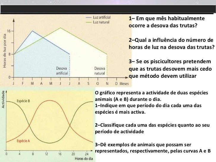 4. 4. 1– Em que mês habitualmente ocorre a desova das trutas? 2–Qual a influência do número de horas de luz na desova das trutas? 3– Se os piscicultores pretendem que as trutas desovem mais cedo que método devem utilizar O gráfico representa a actividade de duas espécies animais (A e B) durante o dia. 1–Indique em que período do dia cada uma das espécies é mais activa. 2–Classifique cada uma das espécies quanto ao seu período de actividade 3–Dê exemplos de animais que possam ser representados, respectivamente, pelas curvas A e B