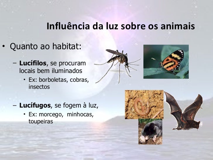 5. 5. Influência da luz sobre os animais <ul><li>Quanto ao habitat: </li></ul><ul><ul><li>Lucífilos , se procuram locais bem iluminados </li></ul></ul><ul><ul><ul><li>Ex: borboletas, cobras, insectos </li></ul></ul></ul><ul><ul><li>Lucífugos , se fogem à luz, </li></ul></ul><ul><ul><ul><li>Ex: morcego, minhocas, toupeiras </li></ul></ul></ul>