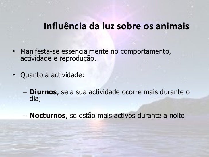 6. 6. Influência da luz sobre os animais <ul><li>Manifesta-se essencialmente no comportamento, actividade e reprodução. </li></ul><ul><li>Quanto à actividade: </li></ul><ul><ul><li>Diurnos , se a sua actividade ocorre mais durante o dia; </li></ul></ul><ul><ul><li>Nocturnos , se estão mais activos durante a noite </li></ul></ul>