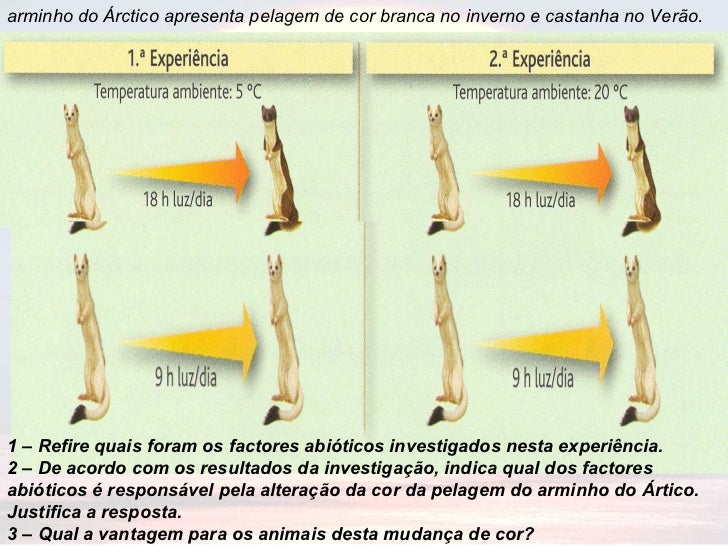 7. 7. arminho do Árctico apresenta pelagem de cor branca no inverno e castanha no Verão. 1 – Refire quais foram os factores abióticos investigados nesta experiência. 2 – De acordo com os resultados da investigação, indica qual dos factores abióticos é responsável pela alteração da cor da pelagem do arminho do Ártico. Justifica a resposta. 3 – Qual a vantagem para os animais desta mudança de cor?