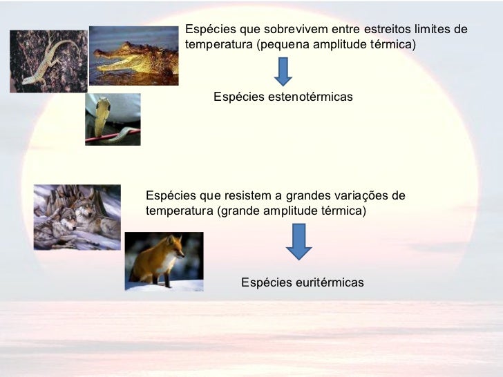 Espécies que sobrevivem entre estreitos limites de temperatura (pequena amplitude térmica) Espécies estenotérmicas Espécie...