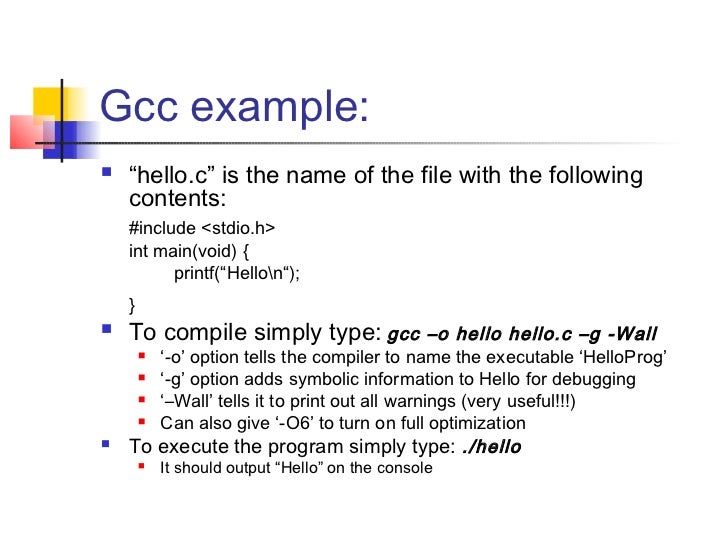 3. 3. Gcc example: “hello.c” is the name of the file with the following contents: #include <stdio.h> int main(void) { printf(“Hellon“); } To compile simply type: gcc –o hello hello.c –g -Wall  ‘-o’ option tells the compiler to name the executable ‘HelloProg’  ‘-g’ option adds symbolic information to Hello for debugging  ‘–Wall’ tells it to print out all warnings (very useful!!!)  Can also give ‘-O6’ to turn on full optimization To execute the program simply type: ./hello  It should output “Hello” on the console