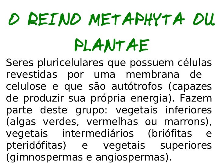 12. 12. O REINO METAPHYTA OU PLANTAE Seres pluricelulares que possuem células revestidas por uma membrana de celulose e que são autótrofos (capazes de produzir sua própria energia). Fazem parte deste grupo: vegetais inferiores (algas verdes, vermelhas ou marrons), vegetais intermediários (briófitas e pteridófitas) e vegetais superiores (gimnospermas e angiospermas).