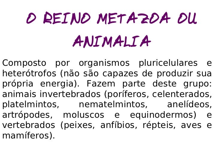 16. 16. O REINO METAZOA OU ANIMALIA Composto por organismos pluricelulares e heterótrofos (não são capazes de produzir sua própria energia). Fazem parte deste grupo: animais invertebrados (poríferos, celenterados, platelmintos, nematelmintos, anelídeos, artrópodes, moluscos e equinodermos) e vertebrados (peixes, anfíbios, répteis, aves e mamíferos).