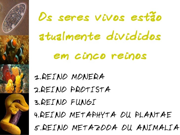 2. 2. Os seres vivos estão atualmente divididos em cinco reinos 1.REINO MONERA 2.REINO PROTISTA 3.REINO FUNGI 4.REINO METAPHYTA OU PLANTAE 5.REINO METAZOOA OU ANIMALIA