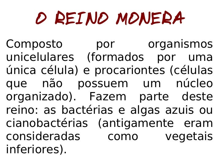 3. 3. O REINO MONERA Composto por organismos unicelulares (formados por uma única célula) e procariontes (células que não possuem um núcleo organizado). Fazem parte deste reino: as bactérias e algas azuis ou cianobactérias (antigamente eram consideradas como vegetais inferiores).