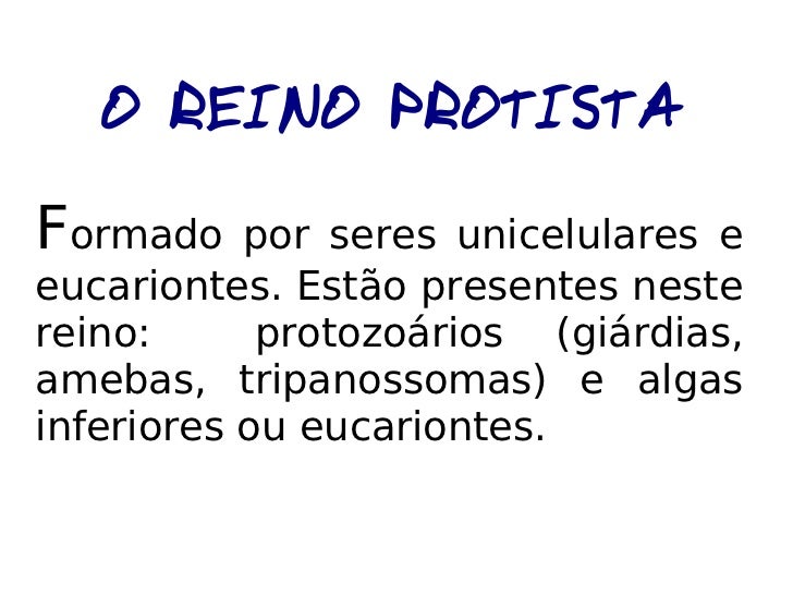 6. 6. O REINO PROTISTA Formado por seres unicelulares e eucariontes. Estão presentes neste reino: protozoários (giárdias, amebas, tripanossomas) e algas inferiores ou eucariontes.