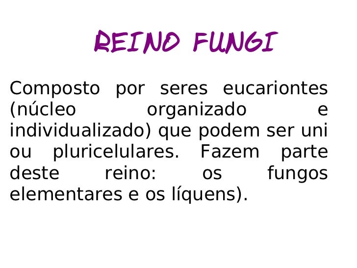 9. 9. REINO FUNGI Composto por seres eucariontes (núcleo organizado e individualizado) que podem ser uni ou pluricelulares. Fazem parte deste reino: os fungos elementares e os líquens).