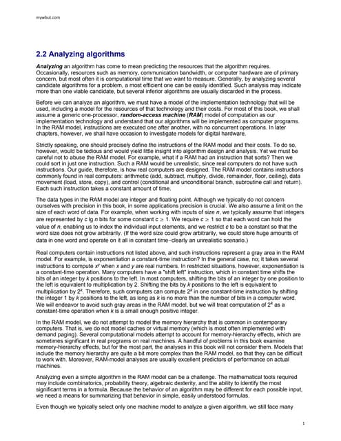 6. 6. Algorithms and Data Structures (Liers) c2g(x) f(x) c1g(x) n0 Figure 2: This schematic picture visualizes the characteristic behavior of two functions f(x), g(x) for which f(x) = Θ(g(x)). assignments. In total, these are n−2 j=1 j = (n−1)(n−2) 2 many assignments, which are quadratically many. 1 Usually, a simplified notation is used for the analysis of algorithms. As often only the characteristic asymptotic behavior of the running time matters, constants and terms of lower order are skipped. More specifially, if the value of a function g(n) is at least as large as the value of a function f(n) for all n ≥ n0 with a fixed n0 ∈ N, then g(n) yields asymptotically an upper bound for f(n), and we write f = O(g). The worst-case running time for insertion sort thus is O(n2 ). Similarly, asymptotic lower bounds are defined and denoted by Ω. If f = O(g), it is g = Ω(f). If a function asymptotically yields a lower as well as an upper bound, the notation Θ is used. More formally, let g : N0 → N0 be a function. We define Θ(g(n)) := {f(n)|(∃c1, c2, n0 > 0)(∀n ≥ n0) : 0 ≤ c1g(n) ≤ f(n) ≤ c2g(n)} O(g(n)) := {f(n)|(∃c, n0 > 0)(∀n ≥ n0) : 0 ≤ f(n) ≤ cg(n)} Ω(g(n)) := {f(n)|(∃c, n0 > 0)(∀n ≥ n0) : 0 ≤ cg(n) ≤ f(n)} In Figure 2, we show the characteristic behavior of two functions for which there exists constants c1, c2 such that f(x) = Θ(g(x)). Example: Asymptotic Behavior Using induction, for example, one can prove that 10n log n = O(n2 ) and vice versa n2 = Ω(n log n). For a, b, c ∈ R, it is an2 + bn + c = Θ(n2 ). In principle, one has to take into account that the O-notation can hide large constants and terms of second order. Although it is true that the leading term de- termines the asymptotic behavior, it is possible that in practice an algorithm with 1 BTW: What kind of instance constitutes the best case for insertion sort? 6