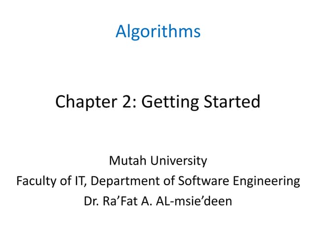 4. 4. Algorithms and Data Structures (Liers) 4main() 5{ 6 int i, j, n; 7 int *A; 8 scanf("%d",&n); 9 A = (int *) malloc((n+1)*sizeof(int)); 10 for (i = 1; i <= n; i++) { 11 scanf("%d",&j); 12 A[i] = j; 13 } 14 insertion_sort(A,n); 15 for (i = 1; i <= n; i++) printf("%5d",A[i]); 16 printf("n"); 17} The implementation of insertion sort is given next. As parameters, it has the array A and its length n. In the for-loop in line 4, the j-th element of the sequence is inserted in the correct position that is determined by the while-loop. In the latter we compare the element to be inserted (key) from ‘right’ to ‘left’ with each element from the sorted subsequence stored in A[1],. . .,A[j-1]. If key is smaller, it has to be insert further left. Therefore, we move A[i] one position to the right in line 9 and decrease i by one in line 10. If the while-loop stops, key is inserted. 1void insertion_sort(int* A, int n) 2{ 3 int i,j,key; 4 for (j = 2; j <= n; j++) { 5 key = A[j]; 6 /* insert A[j] into the sorted sequence A[1...j-1] */ 7 i = j - 1; 8 while ((i > 0) && (A[i] > key) ) { 9 A[i+1] = A[i]; 10 i--; 11 } 12 A[i+1] = key; 13 } 14} 2.1.1 Some Basic Notation and Analysis of Insertion Sort For studying the resource-usage of insertion sort, we need to take into account that some memory is necessary for storing array A. In the following, we focus on analyzing the running time of the presented algorithms as this is the bottleneck for sorting. In order to be able to analyze the resources, we make some simplifying assumptions. We use the model of a ‘random access machine’ (RAM) in which we have one processor and all data are contained in main memory. Each memory access takes the same amount of time. For analyzing the running time, we count the number of primitive operations, 4