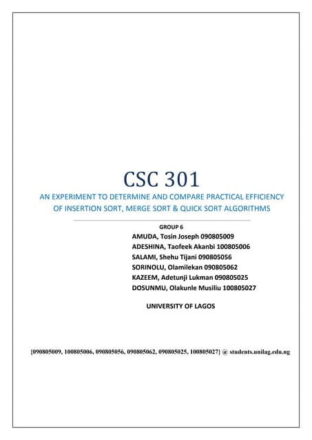 7. 7. 2 Sorting slightly larger asymptotic running time performs better than another algorithm with better O-behavior. It turns out that also the average-case running time of insertion sort is O(n2 ). We will see later that sorting algorithms with worst-case running time bounded by O(n log n) exists. For large instances, they show better performance than insertion sort. However, insertion sort can easily be implemented and for small instances is very fast in practice. 2.2 Sorting using the Divide-and-Conquer Principle A general algorithmic principle that can be applied for sorting consists in divide and conquer. Loosely speaking, this approach consists in dividing the problem into subproblems of the same kind, conquering the subproblems by recursive solution or direct solution if they are small enough, and finally combining the solutions of the subproblems to one for the original problem. 2.2.1 Merge Sort The well-known merge sort algorithm specifies the divide and conquer principle as follows. When merge sort is called for array A that stores a sequence of n numbers, it is divided into two sequences of equal length. The same merge sort algorithm is then called recursively for these two shorter sequences. For arrays of length one, nothing has to be done. The sorted subsequences are then merged in a zip-fastener manner which results in a sorted sequence of length equal to the sum of the lengths of the subsequences. An example implementation in C is given in the following. The main function is similar to the one for insertion sort and is omitted here. The constant infinity is defined to be a large number. Then, merge sort(A,1,n) is the call for sorting an array A with n elements. In the following merge sort implementation, recursive calls to merge sort are performed for subsequences A[p],. . . , A[r]. In line 5, the position q of the middle element of the sequence is determined. merge sort is called for the two sequences A[p],. . . , A[q] and A[q+1],. . . , A[r]. 1void merge_sort(int* A, int p, int r) 2{ 3 int q; 4 if (p < r) { 5 q = p + ((r - p) / 2); 6 merge_sort(A, p, q); 7 merge_sort(A, q + 1,r); 8 merge(A, p, q, r); 9 } 10} In the following, the merge of two sequences A[p],. . .,A[q] and A[q+1],...,A[r] is implemented. To this end, an additional array B is allocated in which the merged sequence is stored. Denote by ai and aj the currently considered elements of each of 7