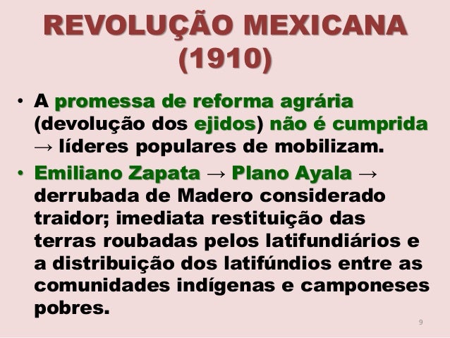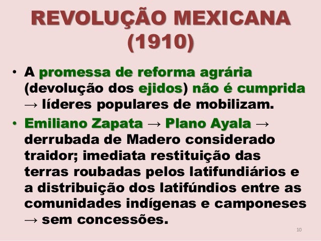 9. 9. REVOLUÇÃO MEXICANA (1910) • A promessa de reforma agrária (devolução dos ejidos) não é cumprida → líderes populares de mobilizam. • Emiliano Zapata → Plano Ayala → derrubada de Madero considerado traidor; imediata restituição das terras roubadas pelos latifundiários e a distribuição dos latifúndios entre as comunidades indígenas e camponeses pobres. 9