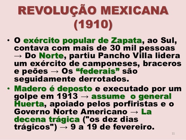 10. 10. REVOLUÇÃO MEXICANA (1910) • A promessa de reforma agrária (devolução dos ejidos) não é cumprida → líderes populares de mobilizam. • Emiliano Zapata → Plano Ayala → derrubada de Madero considerado traidor; imediata restituição das terras roubadas pelos latifundiários e a distribuição dos latifúndios entre as comunidades indígenas e camponeses → sem concessões. 10
