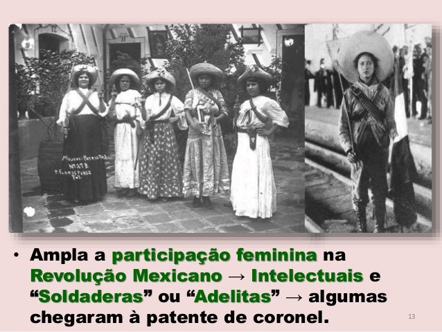 13. 13. • Ampla a participação feminina na Revolução Mexicano → Intelectuais e “Soldaderas” ou “Adelitas” → algumas chegaram à patente de coronel. 13