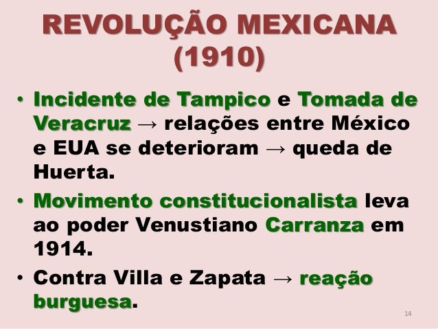 14. 14. REVOLUÇÃO MEXICANA (1910) • Incidente de Tampico e Tomada de Veracruz → relações entre México e EUA se deterioram → queda de Huerta. • Movimento constitucionalista leva ao poder Venustiano Carranza em 1914. • Contra Villa e Zapata → reação burguesa. 14