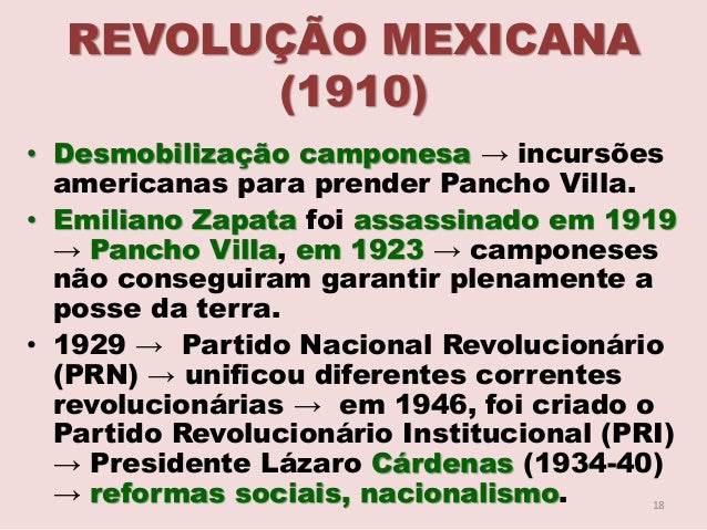 18. 18. REVOLUÇÃO MEXICANA (1910) • Desmobilização camponesa → incursões americanas para prender Pancho Villa. • Emiliano Zapata foi assassinado em 1919 → Pancho Villa, em 1923 → camponeses não conseguiram garantir plenamente a posse da terra. • 1929 → Partido Nacional Revolucionário (PRN) → unificou diferentes correntes revolucionárias → em 1946, foi criado o Partido Revolucionário Institucional (PRI) → Presidente Lázaro Cárdenas (1934-40) → reformas sociais, nacionalismo. 18
