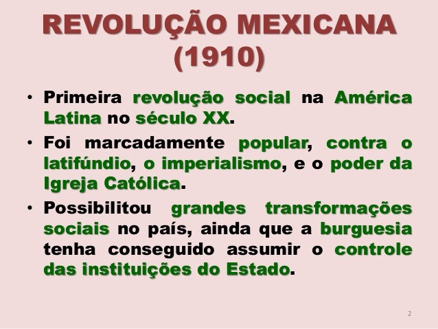 2. 2. REVOLUÇÃO MEXICANA (1910) • Primeira revolução social na América Latina no século XX. • Foi marcadamente popular, contra o latifúndio, o imperialismo, e o poder da Igreja Católica. • Possibilitou grandes transformações sociais no país, ainda que a burguesia tenha conseguido assumir o controle das instituições do Estado. 2