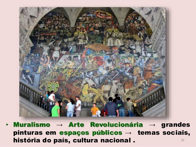 20. 20. • Muralismo → Arte Revolucionária → grandes pinturas em espaços públicos → temas sociais, história do país, cultura nacional . 20