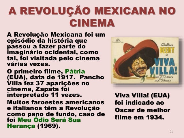 21. 21. A REVOLUÇÃO MEXICANA NO CINEMA A Revolução Mexicana foi um episódio da história que passou a fazer parte do imaginário ocidental, como tal, foi visitada pelo cinema várias vezes. O primeiro filme, Pátria (EUA), data de 1917. Pancho Villa fez 37 aparições no cinema, Zapata foi interpretado 11 vezes. Muitos faroestes americanos e italianos têm a Revolução como pano de fundo, caso de foi Meu Ódio Será Sua Herança (1969). Viva Villa! (EUA) foi indicado ao Oscar de melhor filme em 1934. 21