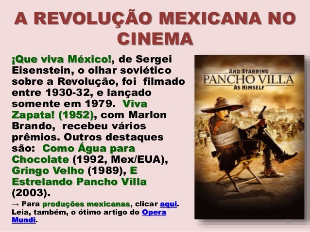 22. 22. A REVOLUÇÃO MEXICANA NO CINEMA ¡Que viva México!, de Sergei Eisenstein, o olhar soviético sobre a Revolução, foi filmado entre 1930-32, e lançado somente em 1979. Viva Zapata! (1952), com Marlon Brando, recebeu vários prêmios. Outros destaques são: Como Água para Chocolate (1992, Mex/EUA), Gringo Velho (1989), E Estrelando Pancho Villa (2003). → Para produções mexicanas, clicar aqui. Leia, também, o ótimo artigo do Opera Mundi. 22