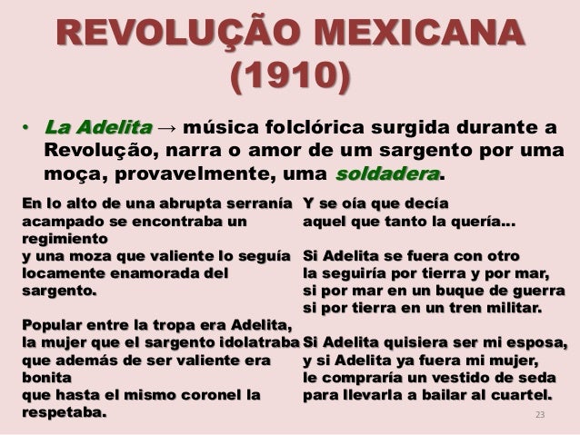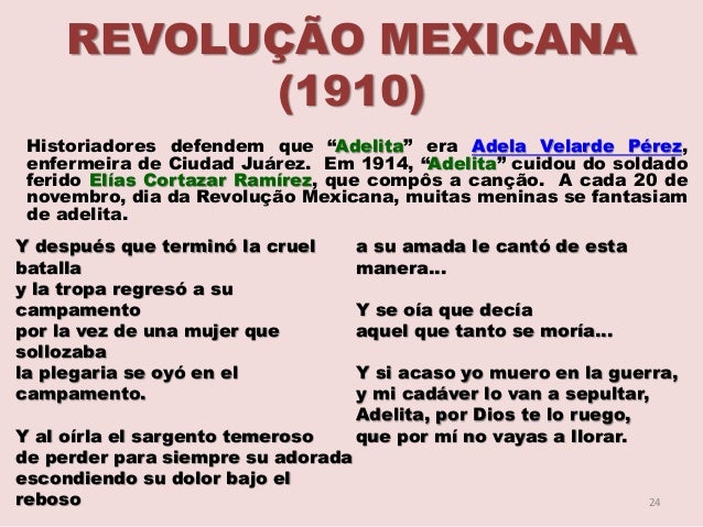 24. 24. REVOLUÇÃO MEXICANA (1910) Historiadores defendem que “Adelita” era Adela Velarde Pérez, enfermeira de Ciudad Juárez. Em 1914, “Adelita” cuidou do soldado ferido Elías Cortazar Ramírez, que compôs a canção. A cada 20 de novembro, dia da Revolução Mexicana, muitas meninas se fantasiam de adelita. Y después que terminó la cruel batalla y la tropa regresó a su campamento por la vez de una mujer que sollozaba la plegaria se oyó en el campamento. Y al oírla el sargento temeroso de perder para siempre su adorada escondiendo su dolor bajo el reboso a su amada le cantó de esta manera… Y se oía que decía aquel que tanto se moría… Y si acaso yo muero en la guerra, y mi cadáver lo van a sepultar, Adelita, por Dios te lo ruego, que por mí no vayas a llorar. 24