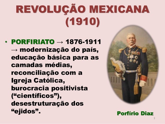 3. 3. REVOLUÇÃO MEXICANA (1910) • PORFIRIATO → 1876-1911 → modernização do país, educação básica para as camadas médias, reconciliação com a Igreja Católica, burocracia positivista (“científicos”), desestruturação dos “ejidos”. Porfírio Diaz 3