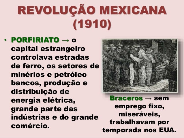 4. 4. REVOLUÇÃO MEXICANA (1910) • PORFIRIATO → o capital estrangeiro controlava estradas de ferro, os setores de minérios e petróleo bancos, produção e distribuição de energia elétrica, grande parte das indústrias e do grande comércio. Braceros → sem emprego fixo, miseráveis, trabalhavam por temporada nos EUA.4
