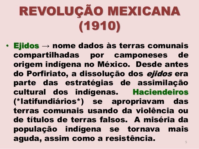 5. 5. REVOLUÇÃO MEXICANA (1910) • Ejidos → nome dados às terras comunais compartilhadas por camponeses de origem indígena no México. Desde antes do Porfiriato, a dissolução dos ejidos era parte das estratégias de assimilação cultural dos indígenas. Haciendeiros (*latifundiários*) se apropriavam das terras comunais usando da violência ou de títulos de terras falsos. A miséria da população indígena se tornava mais aguda, assim como a resistência. 5