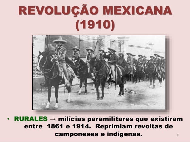 6. 6. REVOLUÇÃO MEXICANA (1910) • RURALES → milícias paramilitares que existiram entre 1861 e 1914. Reprimiam revoltas de camponeses e indígenas. 6