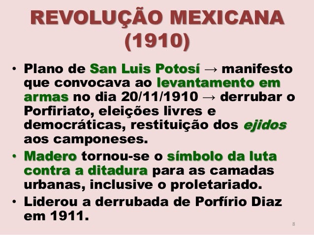7. 7. REVOLUÇÃO MEXICANA (1910) • Pertencia a uma família de latifundiários, mas uniu-se a pequena burguesia urbana, nacionalista. • Movimento contra a reeleição. • Perseguido, exilou-se no Texas de onde lançou o Plano São Luís Potosí. Francisco I. Madero 7