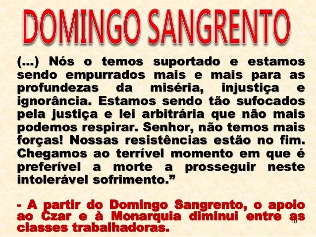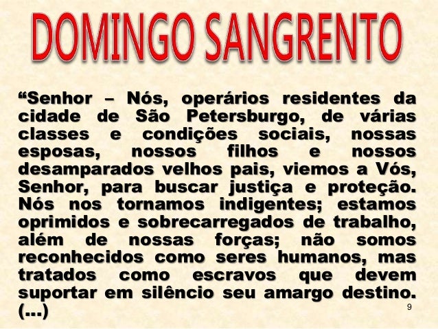 9. 9. 9 “Senhor – Nós, operários residentes da cidade de São Petersburgo, de várias classes e condições sociais, nossas esposas, nossos filhos e nossos desamparados velhos pais, viemos a Vós, Senhor, para buscar justiça e proteção. Nós nos tornamos indigentes; estamos oprimidos e sobrecarregados de trabalho, além de nossas forças; não somos reconhecidos como seres humanos, mas tratados como escravos que devem suportar em silêncio seu amargo destino. (...)