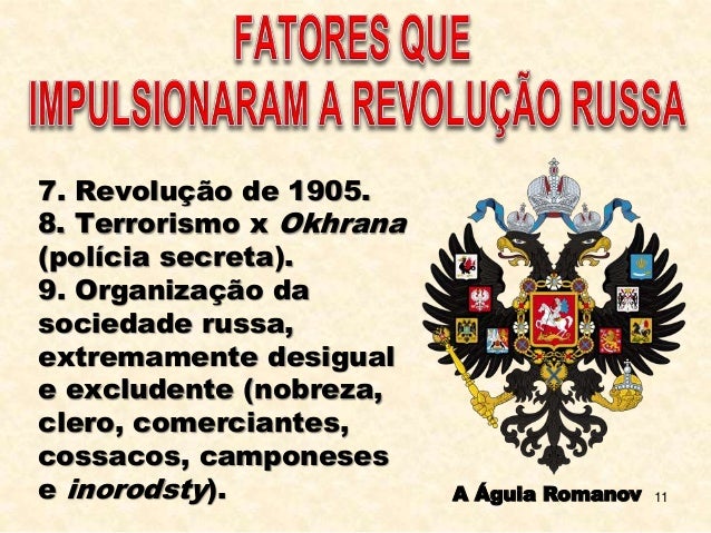 11. 11. 11 7. Revolução de 1905. 8. Terrorismo x Okhrana (polícia secreta). 9. Organização da sociedade russa, extremamente desigual e excludente (nobreza, clero, comerciantes, cossacos, camponeses e inorodsty). A Águia Romanov