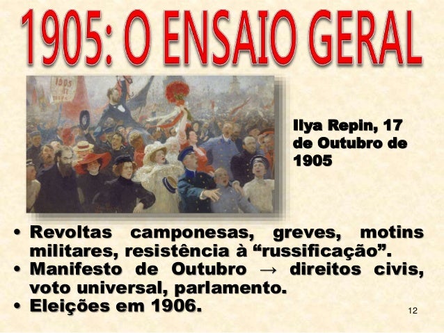 12. 12. 12 • Revoltas camponesas, greves, motins militares, resistência à “russificação”. • Manifesto de Outubro → direitos civis, voto universal, parlamento. • Eleições em 1906. Ilya Repin, 17 de Outubro de 1905