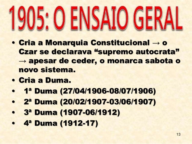 13. 13. 13 • Cria a Monarquia Constitucional → o Czar se declarava “supremo autocrata” → apesar de ceder, o monarca sabota o novo sistema. • Cria a Duma. • 1ª Duma (27/04/1906-08/07/1906) • 2ª Duma (20/02/1907-03/06/1907) • 3ª Duma (1907-06/1912) • 4ª Duma (1912-17)
