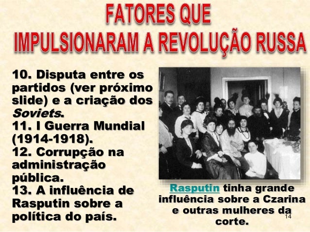 14. 14. 14 10. Disputa entre os partidos (ver próximo slide) e a criação dos Soviets. 11. I Guerra Mundial (1914-1918). 12. Corrupção na administração pública. 13. A influência de Rasputin sobre a política do país. Rasputin tinha grande influência sobre a Czarina e outras mulheres da corte.